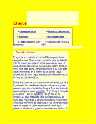 El documento habla sobre el agua. Explica que el agua es esencial para la vida y constituye alrededor del 60% del cuerpo humano. Describe cómo el cuerpo humano pierde y gana agua a través de procesos como la respiración, la sudoración y la ingesta de líquidos. Además, detalla la distribución del agua en la Tierra y su importancia para los seres vivos y las actividades humanas como la agricultura e industria.