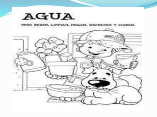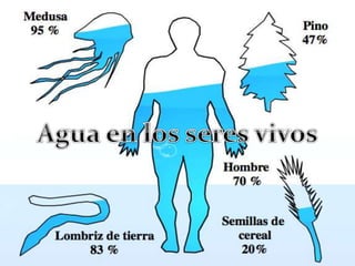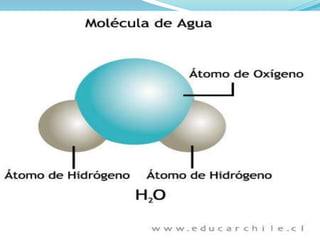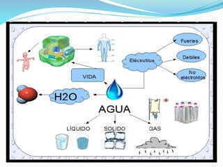El agua es una sustancia vital formada por dos átomos de hidrógeno y uno de oxígeno, cubriendo el 71% de la superficie terrestre y existiendo en estado líquido, sólido y gaseoso. Su distribución es desigual, con el agua dulce representando menos del 1% del total, y es crucial para diversas funciones biológicas, actuando como medio de transporte y regulador térmico. Además, el agua presenta características únicas como incolora, inodora e insípida, y su calidad es regulada por diversas organizaciones para asegurar su uso en diferentes sectores.