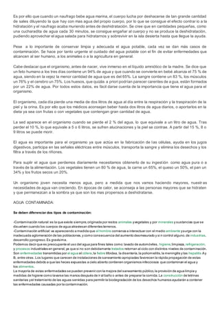 El documento describe los efectos del agua sobre la vida. El agua es esencial para los procesos metabólicos y las reacciones químicas que permiten la replicación del ADN y la vida. También es fundamental para procesos como la fotosíntesis, la respiración celular y las funciones enzimáticas. El agua es un componente crítico para la mayoría de los organismos vivos y los seres humanos contienen grandes porcentajes de agua en su cuerpo.