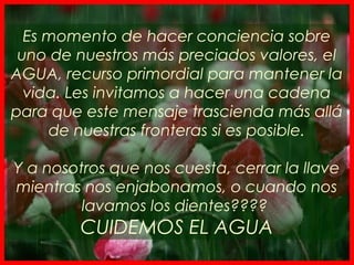 Este documento enfatiza la importancia del agua como un recurso vital y escaso en muchas partes del mundo. Se presentan varios ejemplos de cómo la falta de agua potable afecta negativamente a las comunidades, incluyendo niños en Sudán que beben de pantanos contaminados y aldeanos en Kenia que cavan pozos profundos en busca de agua. El documento concluye instando a la concientización sobre el valor del agua y a esforzarnos por preservar este preciado recurso.