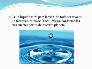 El agua es un líquido vital para la vida que constituye las tres cuartas partes de nuestro planeta. Está formada por dos átomos de hidrógeno y uno de oxígeno y puede disolver muchas sustancias, afectando su sabor u olor. El agua circula continuamente por el planeta a través del ciclo del agua entre la evaporación, transpiración, precipitación y desplazamiento hacia el mar.