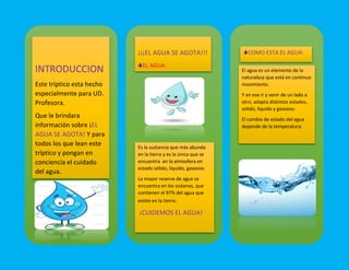 El documento describe los tres estados del agua (sólido, líquido y gaseoso), sus usos principales y formas de ahorrar agua. Explica que el agua es esencial para la hidratación de los cuerpos y tareas domésticas como lavar ropa. Recomienda cerrar los grifos mientras nos lavamos los dientes, reparar grifos que gotean y evitar juguetes que requieran un flujo constante de agua para ahorrar hasta 10 litros.