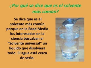El agua es el solvente más común porque en la Edad Media los científicos buscaban un "solvente universal" que disolviera todo y el agua está cerca de lograrlo. El agua se puede encontrar en mares, lagos, ríos, nieve, hielo, lluvia y en todos los seres vivos. El agua pasa por tres estados: sólido, líquido y gaseoso. Es importante usar el agua de forma responsable debido a que es un recurso vital y solo hay un 3% de agua dulce disponible en el plan