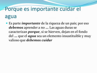 El documento habla sobre la importancia de cuidar el agua. Explica que el agua es un recurso valioso y finito, y que debemos aprender a no desperdiciarla y a usarla de manera sustentable. Luego, detalla algunos hábitos para cuidar el agua, como cerrar el grifo mientras nos lavamos los dientes, reparar grifos que gotean, no dejar correr el agua innecesariamente, y recolectar agua de lluvia. Finalmente, advierte que si no cuidamos el agua podríamos enf