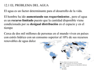 El documento trata sobre el problema del agua como recurso limitado debido a su desigual distribución. Cerca de 2 mil millones de personas viven en países con estrés hídrico. Los principales problemas son el aumento de consumo y la escasez agravada por el cambio climático y la contaminación. Se necesitan soluciones como mejorar la eficiencia del agua, repartir el agua de forma solidaria y nuevas tecnologías para reutilizar y reciclar el agua.