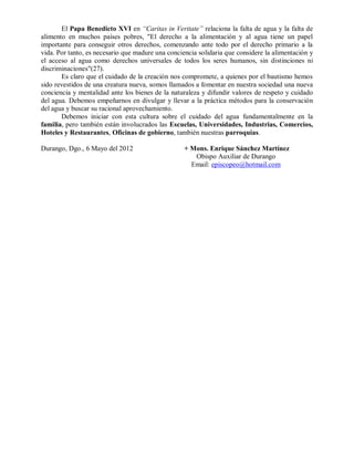 El documento destaca la importancia del agua como un derecho humano y un don de Dios, enfatizando la necesidad de un uso responsable debido a la crisis de sequía. Se resalta que el acceso al agua potable es esencial para la vida y el bienestar, especialmente para las personas en situación de pobreza. Además, se insta a adoptar políticas públicas y generar una conciencia solidaria sobre la conservación y distribución equitativa del agua.
