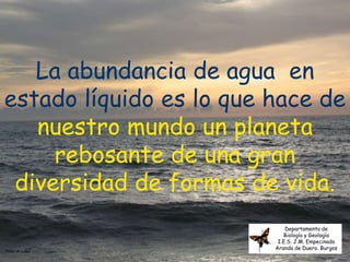 El documento describe las propiedades físico-químicas del agua y su importancia para la vida. Explica que el agua es esencial para la vida debido a su capacidad para disolver sustancias, su amplio rango de temperaturas en fase líquida, y su papel en los procesos bioquímicos. Además, detalla propiedades como su carácter dipolar, su calor específico elevado, y las fuerzas de cohesión y adhesión entre sus moléculas. En general, el documento enfatiza cómo las propiedades