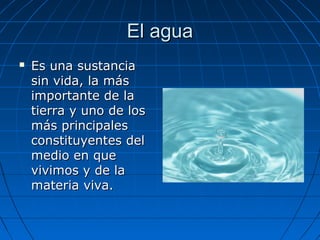 Este documento describe las propiedades y características del agua. Explica que el agua puede presentarse en estado sólido, líquido o gaseoso, y que forma parte integral de los ciclos hidrológicos en la Tierra. También destaca la importancia vital del agua para los seres vivos y la necesidad diaria de consumir agua para mantener un organismo sano.
