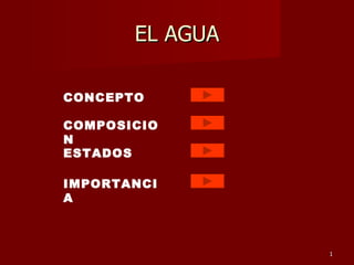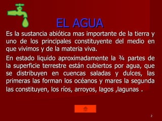 El agua es la sustancia más importante en la Tierra y constituye aproximadamente las tres cuartas partes de la superficie terrestre. Se compone de oxígeno e hidrógeno. Puede encontrarse en tres estados: sólido como hielo y nieve, líquido como océanos, lagos y ríos, y gaseoso como vapor de agua en la atmósfera. Es importante porque interviene en la composición de los seres vivos, es indispensable para la vida como alimento y transporta nutrientes dentro de los organismos.