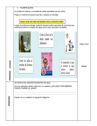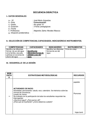 Este documento presenta una secuencia didáctica de 3 horas para el área de Comunicación en 4to grado sobre el cuidado del agua. La secuencia incluye datos generales, competencias y capacidades, estrategias metodológicas y recursos. Las actividades se enfocan en identificar formas de uso del agua, generar compromisos para su cuidado a través de diálogo y ejemplos, y reflexionar sobre lo aprendido.