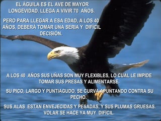 El documento describe el proceso de renovación que debe hacer el águila a los 40 años para continuar viviendo. Cuando sus garras y plumas están desgastadas, el águila debe volar a lo alto de una montaña, arrancarse el pico con su fuerza y esperar 5 meses a que le crezca uno nuevo, permitiéndole renovar sus garras y plumas y volar por 30 años más.