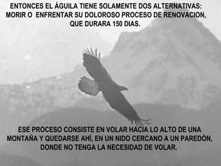 El águila vive hasta 70 años, pero a los 40 años debe tomar una decisión difícil: renovarse o morir. Para renovarse, el águila vuela a lo alto de una montaña y se queda allí 150 días, golpeando su pico contra la pared hasta desprenderlo y dejar que crezca uno nuevo, también desprenderá y reemplazará sus plumas y garras. Este doloroso proceso de renovación le dará 30 años más de vida.