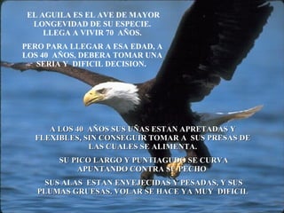 El águila vive hasta 70 años, pero a los 40 años debe tomar una difícil decisión ya que sus garras y pico se han debilitado y no puede cazar. Sus opciones son morir o someterse a un proceso de renovación de 150 días en el que desprenderá sus garras y plumas viejas para que crezcan unas nuevas, lo que le dará 30 años más de vida.