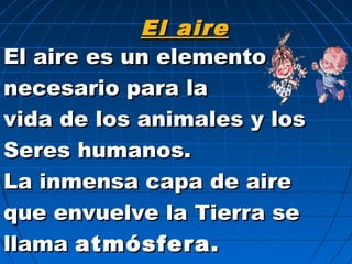 El aire es un elemento necesario para la vida que envuelve la Tierra en la atmósfera. Está compuesto principalmente de nitrógeno (78%), oxígeno (21%) y pequeñas cantidades de dióxido de carbono y vapor de agua. El aire es incoloro, inodoro e insípido pero conduce el calor, sonido y ondas. Es necesario para la respiración, combustión y fotosíntesis de las plantas.