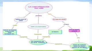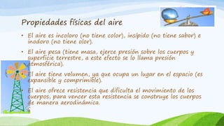 El documento describe las propiedades físicas y químicas del aire. Físicamente, el aire es incoloro, insípido, inodoro y tiene masa y volumen. Químicamente, contiene principalmente nitrógeno (78%) y oxígeno (21%), además de pequeñas cantidades de gases nobles y dióxido de carbono. El aire también se describe como un recurso renovable debido a procesos naturales como el viento, que puede generar energía eólica.