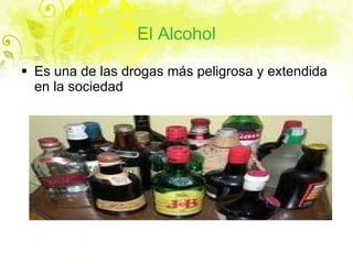 El documento habla sobre los efectos del alcohol y otras drogas como el tabaco, la cocaína y la marihuana. Explica que el alcohol es una de las drogas más extendidas y peligrosas, causando efectos como la pérdida de coordinación y reflejos. También discute los factores que afectan los efectos del alcohol como la edad, sexo y cantidad consumida. Otras secciones cubren los efectos del tabaquismo, las diferencias entre drogas duras y blandas, y la dependencia física y psíquica causada por muchas drogas.