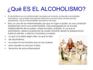 El documento trata sobre el alcoholismo. Explica que el alcoholismo es una enfermedad causada por el abuso del alcohol que puede tener consecuencias graves para la salud y ser hereditaria. También discute las consecuencias sociales y familiares del alcoholismo, como la pérdida del trabajo y del apoyo de amigos y familiares. Resalta la importancia de buscar ayuda profesional para tratar el alcoholismo.