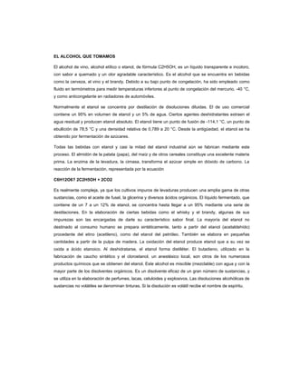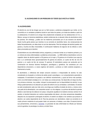 El documento habla sobre los efectos negativos del alcoholismo y el consumo excesivo de alcohol. Explica que el alcoholismo es una enfermedad crónica y progresiva que afecta el cerebro y puede causar daño o la muerte. También describe los efectos a corto plazo del alcohol, como la reducción del funcionamiento del sistema nervioso y las neuronas. Finalmente, señala algunas de las causas comunes del consumo de alcohol entre los jóvenes, como divertirse con amigos o escapar del estrés.