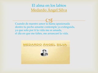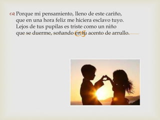 Este poema expresa el intenso amor del autor por su amada. El poeta dice que si ella ya no lo ama, él se quitará la vida. Añora estar cerca de ella y besarla. Vive anhelando llamarla suya y, lejos de ella, comprende cuánto la ama. No tiene palabras para expresar su pasión devoradora, solo puede dejar su palpitante corazón en sus manos para demostrar su amor.