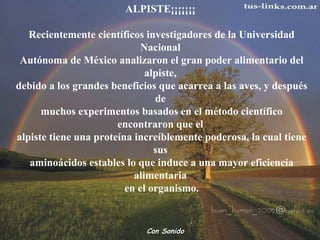 El documento describe las propiedades nutricionales y beneficios para la salud del alpiste. Los científicos encontraron que el alpiste tiene una proteína muy poderosa con aminoácidos estables que mejoran la eficiencia alimentaria. El alpiste también contiene enzimas que pueden desinflamar órganos como el hígado y el páncreas, ayudar a eliminar la diabetes y la cirrosis, y combatir la hipertensión y la obesidad. Se recomienda tomar dos o tres vasos de leche de alpiste lic