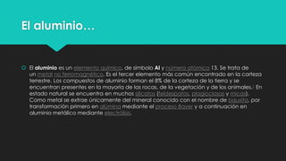 El documento resume las propiedades, historia, producción y usos del aluminio. Específicamente, describe que el aluminio es un metal ligero y abundante extraído principalmente de la bauxita. Tiene excelentes propiedades como buen conductor eléctrico y térmico y es maleable, lo que permite numerosas aplicaciones como en transporte, construcción y embalaje. Explica también los procesos de extracción del aluminio a partir de la bauxita y su refinación por electrólisis.