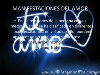 Este documento trata sobre el concepto del amor. Define el amor como un sentimiento universal que se manifiesta de diferentes formas según la ideología o perspectiva. En el contexto filosófico, el amor representa la bondad, compasión y afecto humanos. El amor también se puede describir como acciones dirigidas a otros basadas en la compasión o el afecto. El documento luego clasifica las manifestaciones del amor en las relaciones personales y menciona algunos símbolos asociados con el amor a través de la historia como las