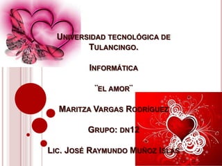 Este documento resume diferentes tipos de amor como el amor autopersonal, amor incondicional, amor filial, amor fraternal, amor romántico, amor confluente, amor platónico y amor sexual. También describe brevemente la simbología comúnmente asociada con el amor como el corazón y Cupido, y enumera algunas fuentes consultadas para el documento.