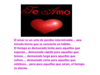 El documento presenta varias reflexiones sobre el amor. Describe el amor como un sentimiento que crece con el tiempo y el compromiso de las partes, un acto de perdón constante y una mirada tierna que se convierte en hábito. También señala que el amor verdadero requiere de cierta locura y que es un juego donde ambos pueden ganar si se enfocan en la felicidad mutua más que en la propia. Finalmente cuestiona la idea de que el amor no existe o es una mentira.
