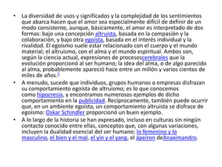 El documento resume las diferentes concepciones del amor desde perspectivas filosóficas, religiosas y científicas. Define el amor como un sentimiento universal que puede interpretarse de forma egoísta o altruista y describe las emociones y comportamientos asociados. Explica que, desde un punto de vista evolutivo, el amor surge del instinto de supervivencia pero que la selección de grupos favoreció el altruismo. También analiza las teorías de Dawkins sobre los genes egoístas y la capacidad humana de elegir entre el egoí