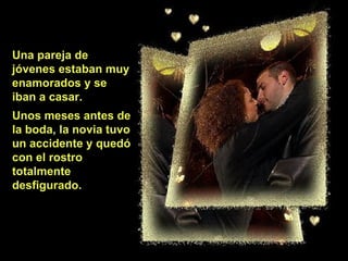 Una pareja joven se iba a casar, pero la novia sufrió un accidente que la dejó con el rostro desfigurado. Ella le dijo a su novio que no podían casarse porque ya no era hermosa, pero él le respondió que había enfermado y se iba a quedar ciego, y aun así quería casarse con ella. Se casaron y él fingió estar ciego para que ella no se sintiera mal por su apariencia. Vivieron 20 años de amor hasta que ella murió, y entonces él reveló que nunca había estado cie