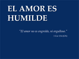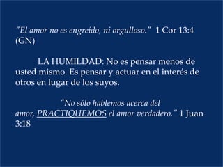Este documento describe la humildad y cuatro hábitos para practicarla: 1) Dar preferencia a otros antes que a uno mismo, 2) Aprender de otros en lugar de rechazar la crítica, 3) Admitir cuando se está equivocado, y 4) Entregar los propios planes a Dios en lugar de aferrarse a ellos. La humildad significa pensar y actuar en interés de otros más que en uno mismo.