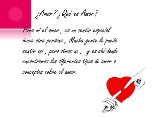 Este documento explora los diferentes tipos y conceptos de amor a través de citas literarias y filosóficas. Incluye una biografía del escritor alemán Johann Wolfgang von Goethe, autor de la novela Los sufrimientos del joven Werther, y resume la trama de esta obra sobre un joven que se enamora de una mujer comprometida y finalmente se suicida. El documento concluye que el amor es subjetivo y tiene diferentes significados para cada persona.