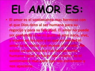 El documento describe los diferentes tipos de amor, incluyendo el amor romántico, práctico, obsesivo y altruista. Explica que el amor es el sentimiento más importante y hermoso, y que puede manifestarse de diversas formas como el amor a la familia, amigos y actividades. También discute que el verdadero amor se demuestra a través de respeto, buenas acciones y afecto, y no solo con palabras bonitas.