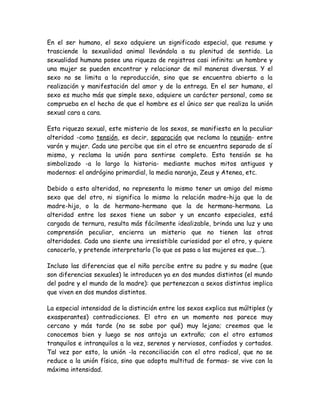 El documento discute la naturaleza de la relación entre hombres y mujeres. Argumenta que la diferenciación sexual humana va más allá de la simple reproducción y crea una alteridad o distinción especial entre los sexos. Esta diferencia hace que cada sexo sea un misterio y un espejo fascinante para el otro, atrayéndolos a una unión íntima a pesar de su separación fundamental. El documento también sugiere que la relación entre Adán y Eva ilustra cómo cada uno encuentra en el otro la otra mitad de su humanidad.