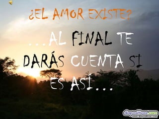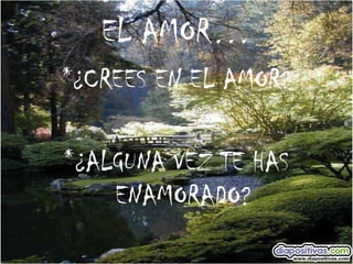 Este documento explora la naturaleza del amor a través de una serie de preguntas reflexivas. Plantea interrogantes sobre las experiencias personales con el amor, incluyendo el grado de compromiso emocional en las relaciones y las consecuencias del abandono. Finalmente, concluye que el amor existe en las relaciones familiares incondicionales y desinteresadas, aunque también reconoce que algunas personas buscan en las parejas el amor que les faltó de niños, lo que puede llevar a relaciones codependientes.