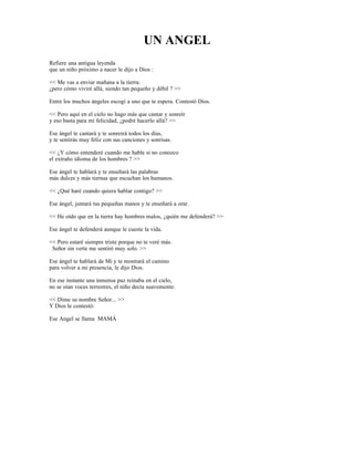 El documento es una leyenda que narra el diálogo entre un niño que está por nacer y Dios. El niño expresa sus temores sobre vivir en la tierra, como ser pequeño y débil, no poder cantar y sonreír, no entender el lenguaje humano, no saber cómo hablar con Dios o defenderse de los hombres malos. Dios lo tranquiliza diciéndole que ha escogido un ángel que lo cuidará, lo hará feliz cantando y sonriendo, le enseñará palabras dulces, le enseñará a orar,