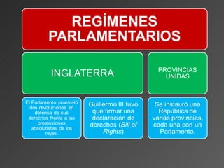El documento resume los principales aspectos del Antiguo Régimen en Europa entre los siglos XVII y XVIII. Aborda la población y economía preindustrial basada en la agricultura, la sociedad estamental dividida en nobleza, clero y tercer estado, el ascenso de la monarquía absoluta y el parlamentarismo británico, y la crítica de la Ilustración a este sistema a través de pensadores como Montesquieu, Voltaire y Rousseau.