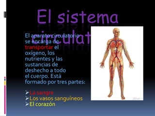 El documento describe el sistema circulatorio humano, incluyendo la sangre, los vasos sanguíneos, el corazón y cómo funciona la circulación. Explica la circulación pulmonar y general, así como algunas curiosidades y enfermedades relacionadas con el sistema circulatorio.