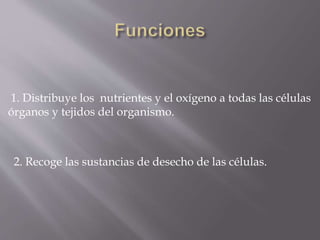 El documento describe el sistema circulatorio, incluyendo la sangre, el corazón y los vasos sanguíneos. La sangre es transportada por el corazón a través de las arterias, y recogida por las venas para ser oxigenada en los pulmones y distribuida a todo el cuerpo, proporcionando oxígeno y nutrientes a las células y recogiendo desechos. El corazón bombea la sangre en un circuito cerrado a través de la circulación pulmonar y sistémica. Los vasos sanguíneos como arterias,
