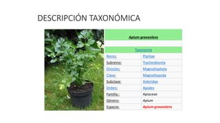 El documento describe la taxonomía, historia, valor nutricional y beneficios para la salud del apio. Originario del Mediterráneo y Oriente Medio, el apio se empezó a cultivar en Italia en el siglo XVI y se introdujo en las islas Británicas a finales del siglo XVII. Es bajo en calorías pero rico en fibra, vitaminas y minerales. Sus beneficios incluyen depurar el cuerpo, mejorar la digestión, ayudar a perder peso y reducir la tensión arterial. Se puede consumir crudo, coc