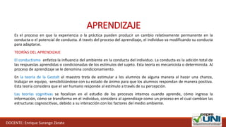 Este documento presenta una introducción al aprendizaje y sus teorías principales como el conductismo, la teoría de la Gestalt y las teorías cognitivas. También describe los tipos de condicionamiento clásico y operante, incluyendo los experimentos de Pavlov. Finalmente, discute otros tipos de aprendizaje como el motor, cognitivo y social.