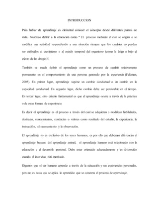 El documento habla sobre el concepto de aprendizaje. Define el aprendizaje como un proceso de cambio en el comportamiento o capacidad conductual de una persona, generado por la experiencia. Explica que existen diversas formas de aprendizaje y que no todas las personas aprenden de la misma manera. También discute el rol cambiante del profesor y el alumno en el proceso de enseñanza-aprendizaje.