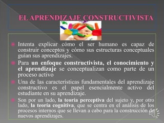 El documento explica diferentes enfoques constructivistas del aprendizaje. Expone que desde una perspectiva constructivista, el conocimiento se adquiere de forma activa a través de la construcción de conceptos basados en conocimientos previos. También destaca el papel activo del estudiante y la importancia de la colaboración social en el aprendizaje. Finalmente, presenta cuatro variantes del constructivismo que difieren en el rol que le asignan al contexto social.
