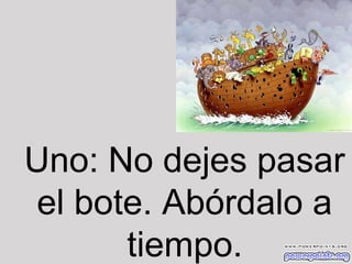 El documento ofrece once lecciones de vida aprendidas de la historia bíblica de Noé y el Arca. Algunas de las lecciones incluyen abordar oportunidades a tiempo, trabajar juntos como comunidad, planificar con anticipación, concentrarse en la tarea en lugar de las críticas, y recordar que incluso las tormentas más difíciles eventualmente darán paso a un arco iris.