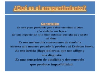 El documento define el arrepentimiento genuino según la Confesión de Fe de Westminster como cuando un pecador siente dolor y odio por sus pecados al comprender la misericordia de Dios en Cristo, dejando sus pecados y esforzándose por obedecer a Dios. Explica que el arrepentimiento es necesario para el perdón de todos los pecados, ya sean grandes o pequeños. También contrasta el arrepentimiento genuino con casos bíblicos de arrepentimiento falso por temor al castigo o a perder bendiciones.