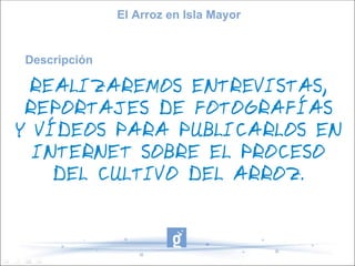 Este proyecto documentará el proceso de cultivo del arroz en Isla Mayor a través de entrevistas, fotografías y videos publicados en internet. Cubrirá temas como las aves que visitan la zona y el cangrejo rojo. El objetivo es crear un recurso en línea para que los usuarios aprendan sobre las distintas actividades y paisajes relacionados con el cultivo del arroz a lo largo de su ciclo, así como promover el municipio y resaltar la pesca y el trabajo derivado del cangrejo rojo.