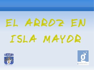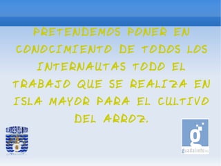 El documento habla sobre el cultivo del arroz en la isla de Isla Mayor, Andalucía. Detalla los paisajes creados por el cultivo del arroz, las aves que visitan la zona, y cómo el cangrejo rojo encuentra un hábitat ideal en los arrozales. También describe las actividades locales como charlas con agricultores, fotografías y videos de las tareas de cultivo, y propuestas a empresas para aportar datos. Finalmente, menciona las entidades colaboradoras como el ayuntamiento, organizaciones agrícol