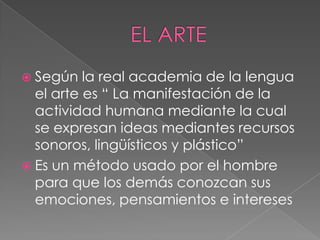 El documento resume la historia del arte desde la prehistoria hasta la época moderna. Explica que el arte ha evolucionado a lo largo de los tiempos y ha estado influenciado por factores como la religión y el entorno. Se destacan diferentes movimientos artísticos como el renacimiento, el barroco, el romanticismo y el impresionismo, y cómo estos transformaron la literatura, música, pintura, escultura y arquitectura.