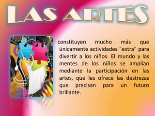 El documento describe la importancia de las artes en la educación de los niños. Las artes les enseñan tolerancia y expresión creativa, y promueven el trabajo individual y en equipo para mejorar la confianza y el rendimiento académico. Se recomienda que los padres canten y bailen con sus hijos, y les den oportunidades para expresarse a través del dibujo.