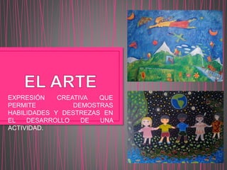 Este documento presenta diferentes formas de expresión creativa para niños en edad escolar como la artesanía, la literatura y la lectura. Describe técnicas manuales como rasgado, recortado y pintura digital, así como géneros literarios como cuentos, fábulas y poesía. Resalta que la lectura y estas actividades creativas favorecen el desarrollo integral de los niños.